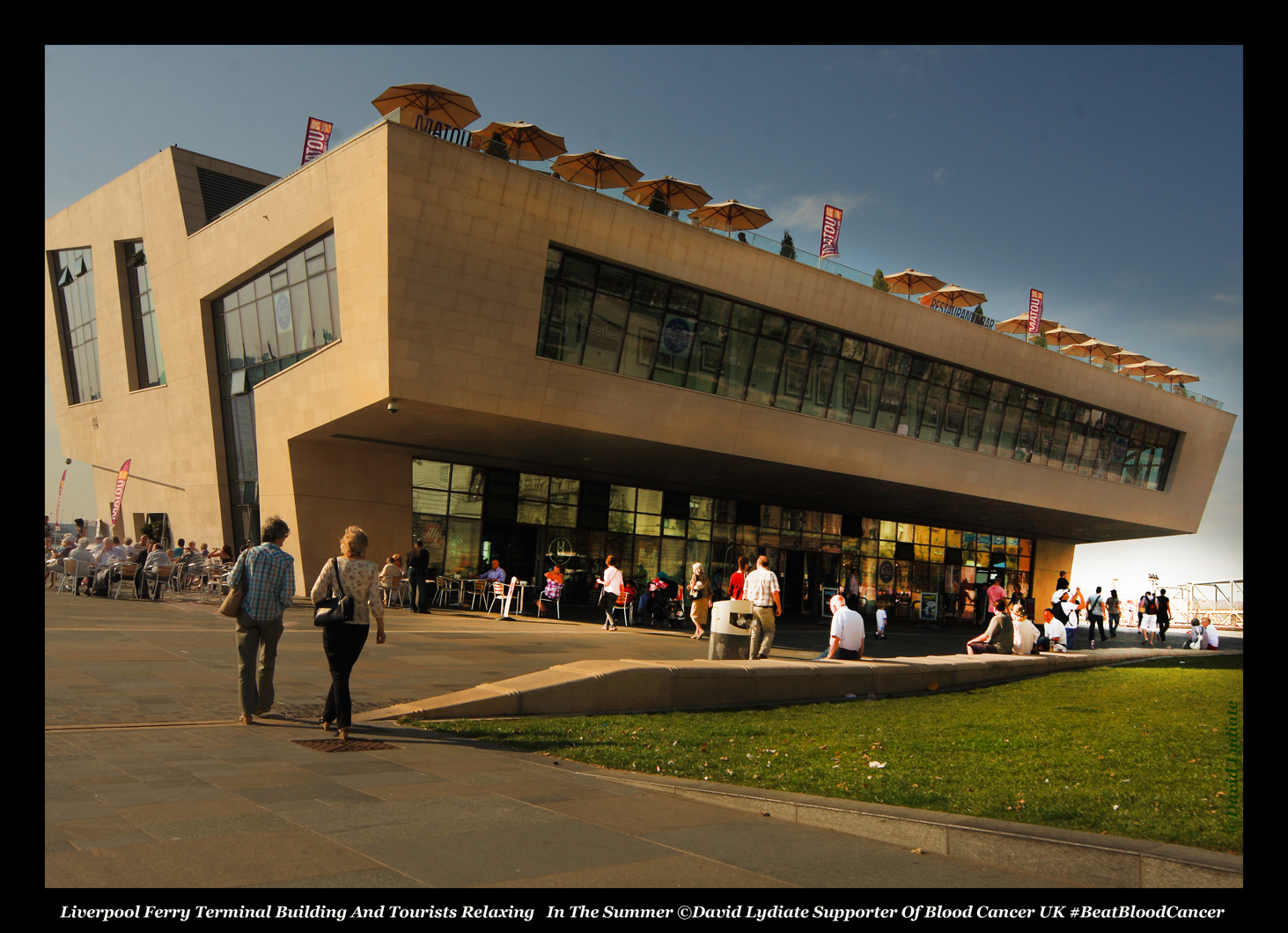 Tourists relax and walk outside Liverpool’s Ferry Terminal Building.
