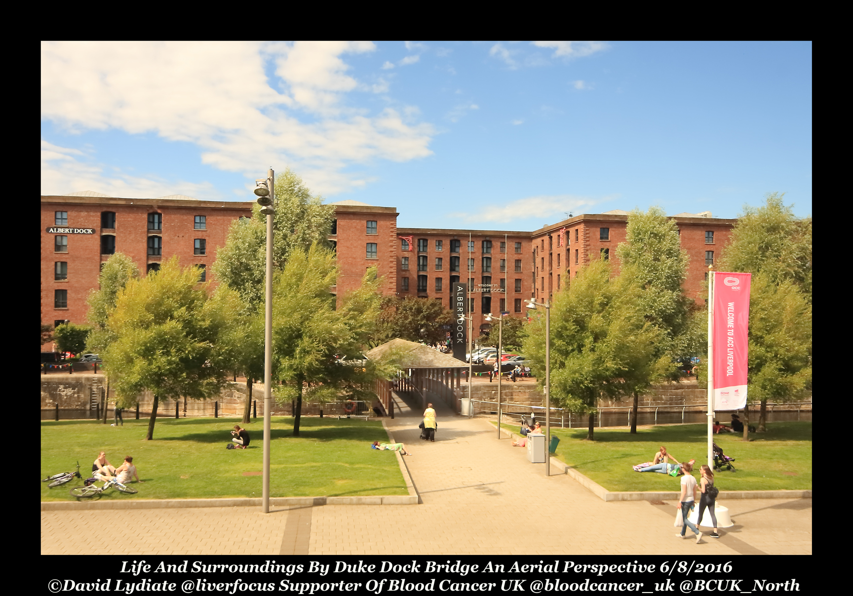 Above Walls of Albert Dock (left), Dukes Dock, Duke Dock Bridge & surrounding lawns (centre).