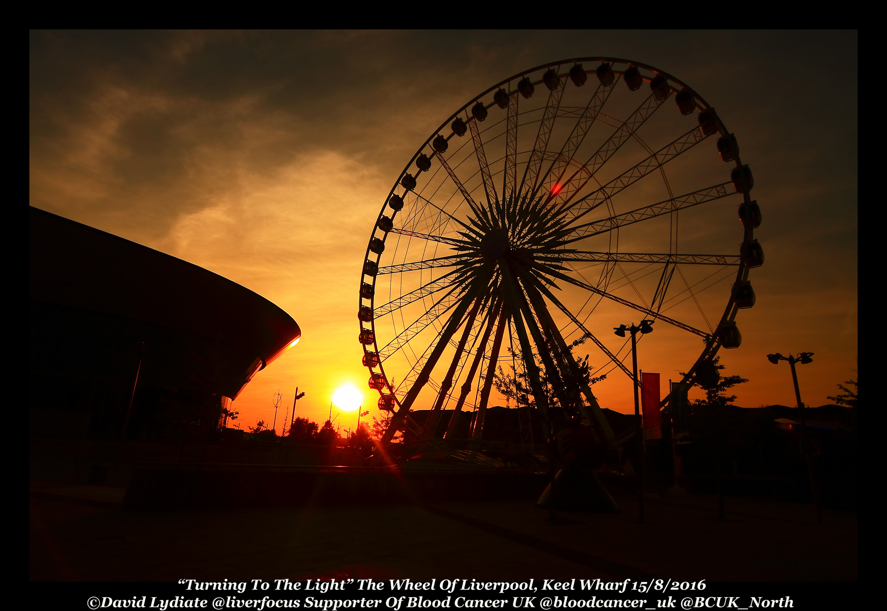 The Wheel Of Liverpool is silhouetted, the curved design of The Liverpool Arena