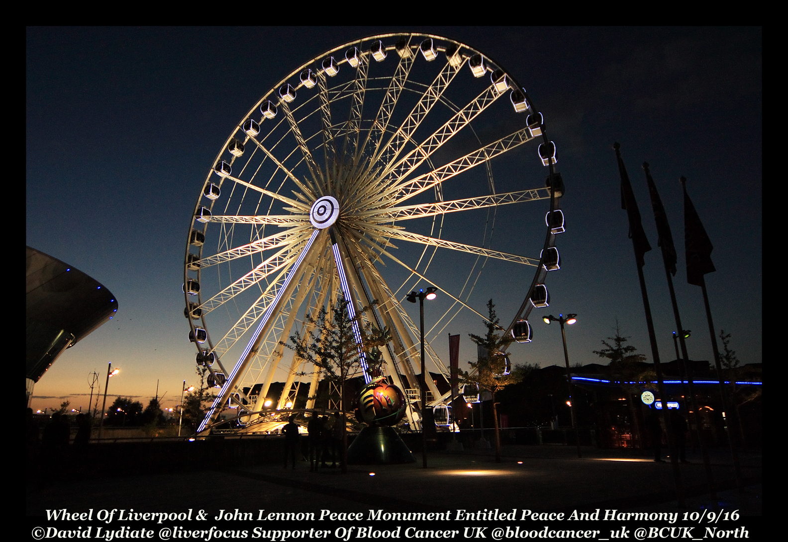 Above The Wheel Of Liverpool and The John Lennon Peace Monument, the name of the sculpture is “Piece And Harmony”, created by Lauren Voiers, a 19 year old American Artist. The John Lennon Peace Monument is also known as The European Peace Monument, dedicated to the memory of John Lennon.
