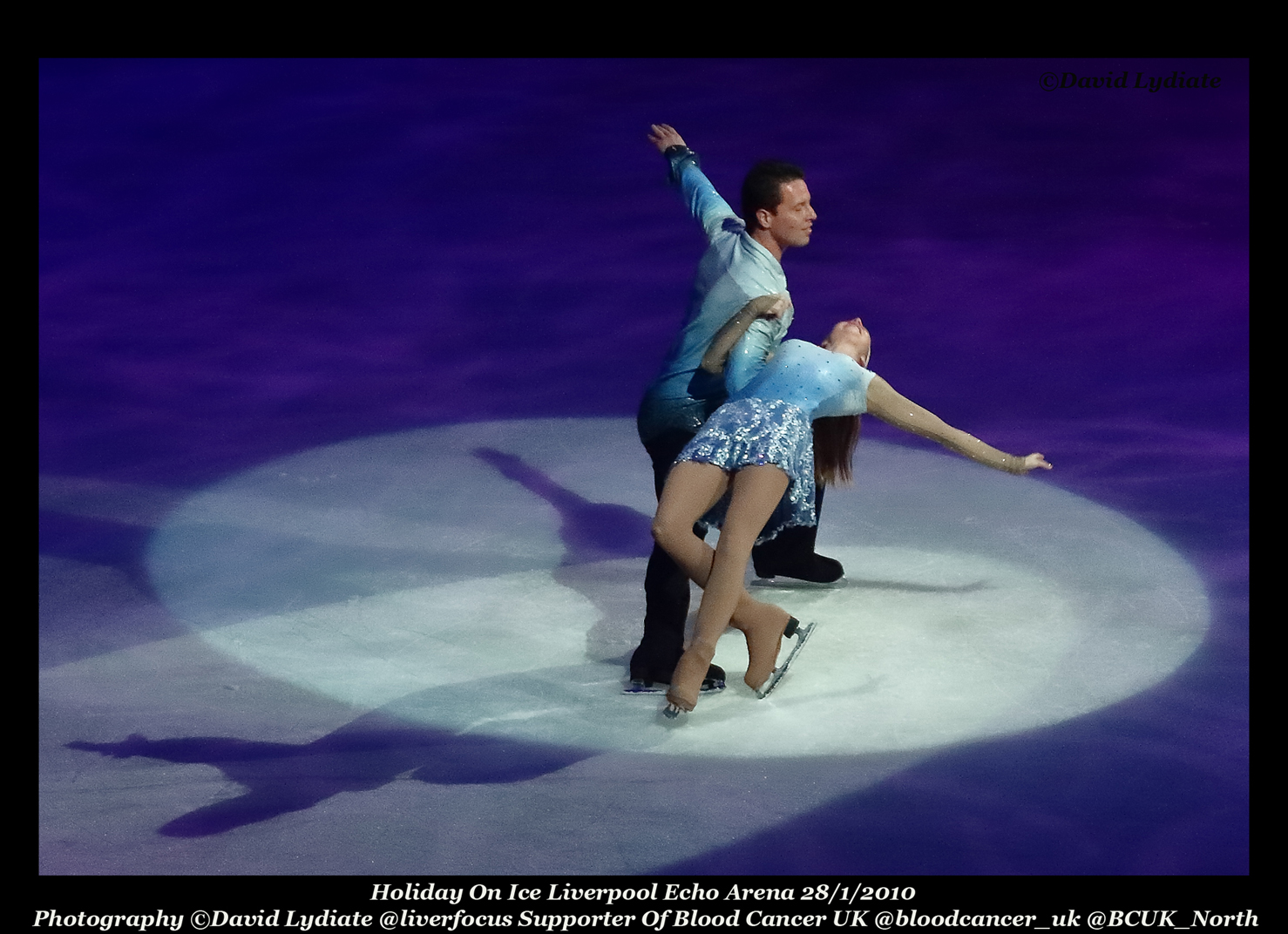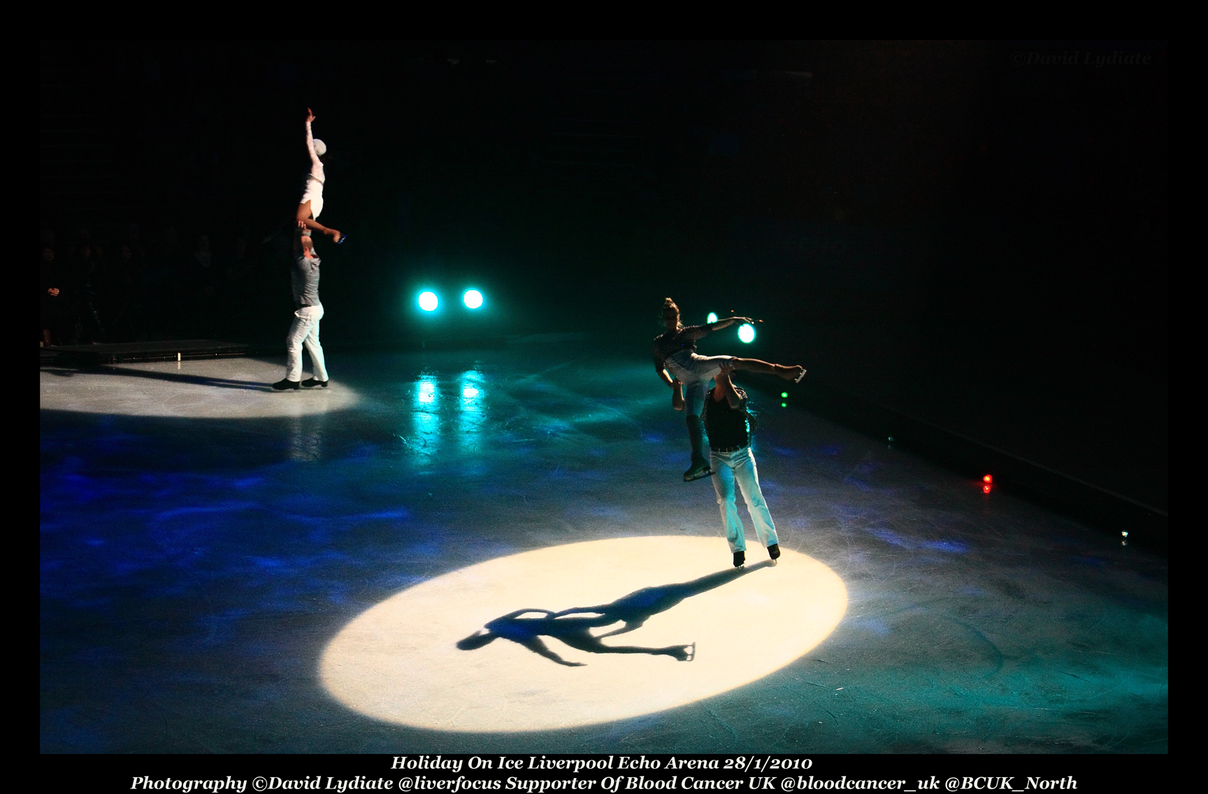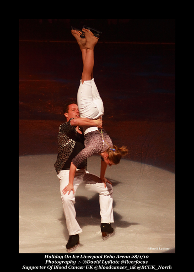 Below Kyran Bracken (MBE and former England Rugby World Cup winner), winner of ITV’s “Dancing On Ice” in 2007 supports a female dancer who is upside down holding onto his knees in Holiday On Ice’s “Spirit”.